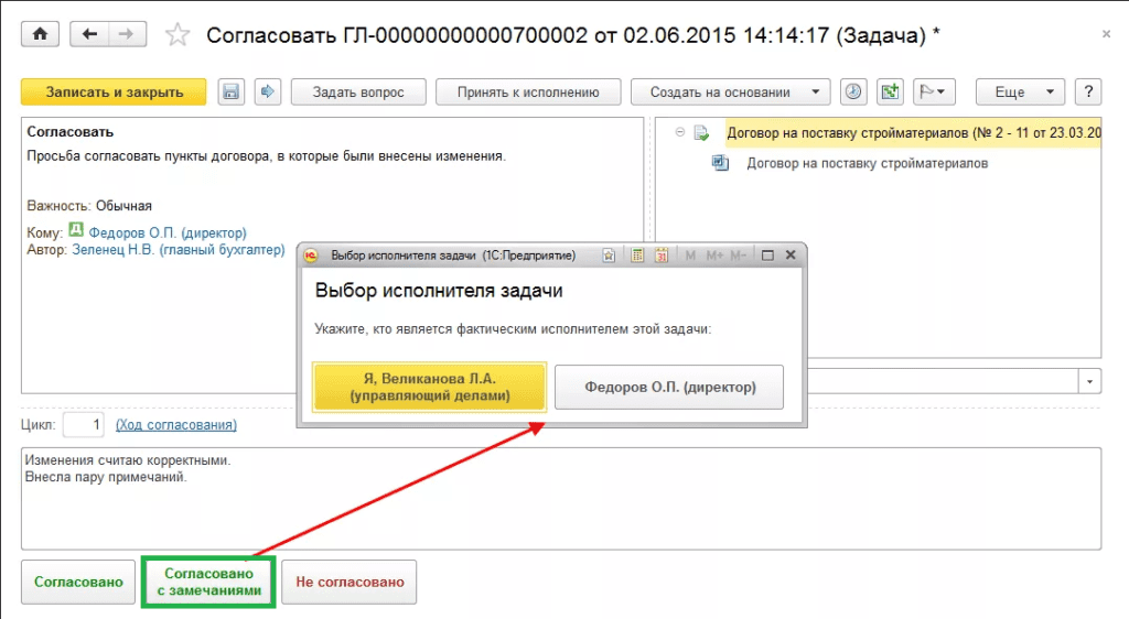 На самом деле все равно возникает много вопросов по использованию данных операций и в связи с этим мы рекомендуем отключение функции «Согласовано с замечаниями», если в организации возникают недопонимания по использованию данных функций программы.
