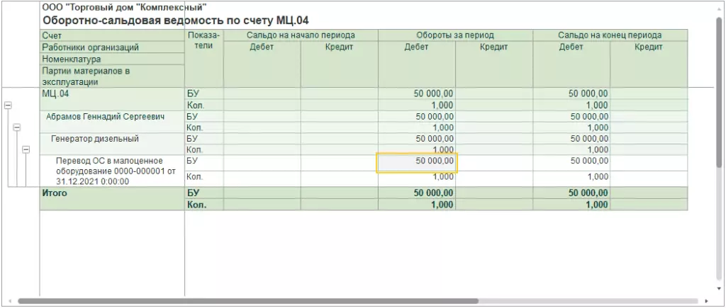 В нашем случае на счете МЦ.04 учтен генератор дизельный, который поступил в результате перевода ОС в малоценное оборудование после перехода на ФСБУ 6.
