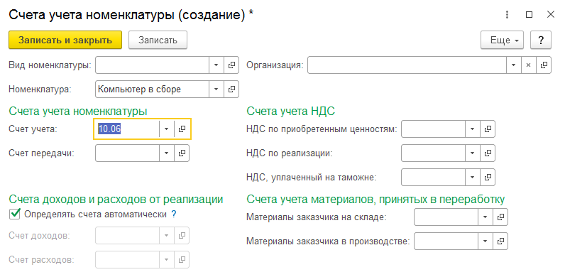 После данной настройки, такие счета учета будут проставляться у всей номенклатуры с видом материалы, если для позиции не установлены другие счета.