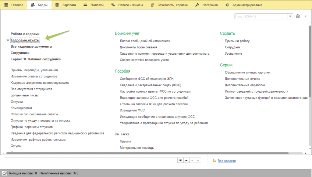 Откроем любой список отчетов, например кадровые