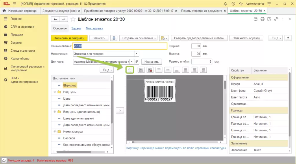 Необходимо открыть шаблон этикетки и кликнуть по кнопке Установка параметров страницы документов