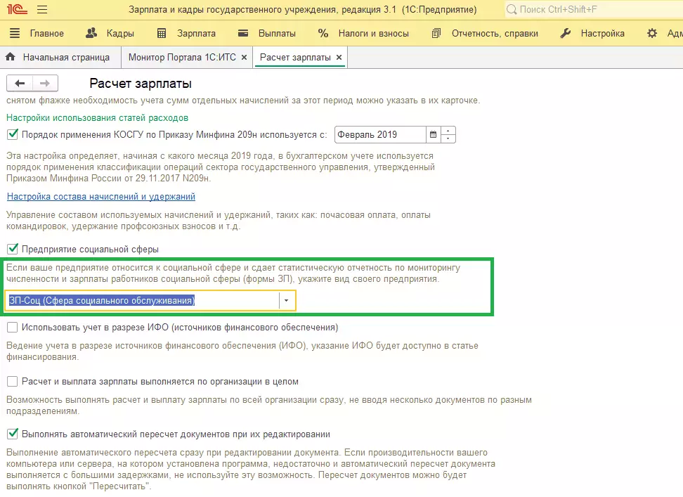 Если отчет не заполняется, необходимо проверить настройки расчета зарплата, раздел Настройки — Расчет зарплаты, установим флаг Предприятие социальной сферы, как на рисунке ниже.