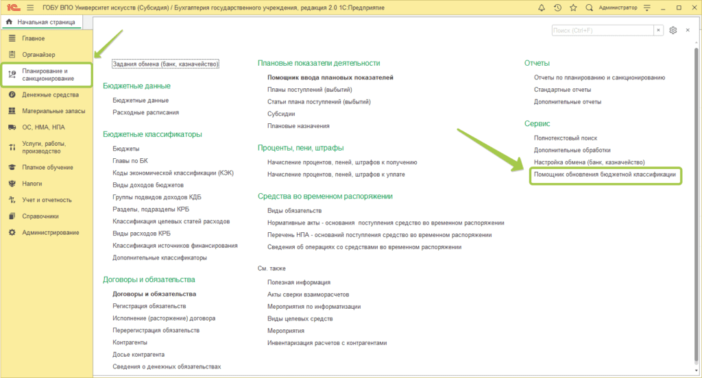 Для обновления бюджетной классификации в 1С Бухгалтерия государственного учреждения 2 необходимо перейти в раздел Планирование и санкционирование — Помощник обновления бюджетной классификации.