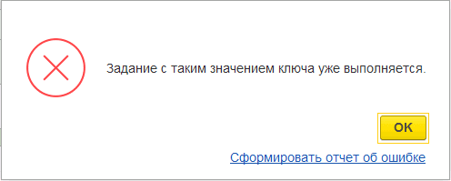 Если ошибка «Задание с таким значением ключа уже выполняется» повторяется необходимо обновить конфигурацию до последней версии.