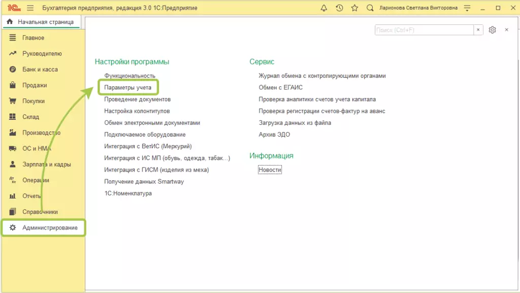 Начнем с того, что проверим настройки функциональности вашей информационной базы. Нам необходимо, чтобы в программе, был активирован учет по складам для этого перейдем в раздел Администрирование — Параметры учета.
